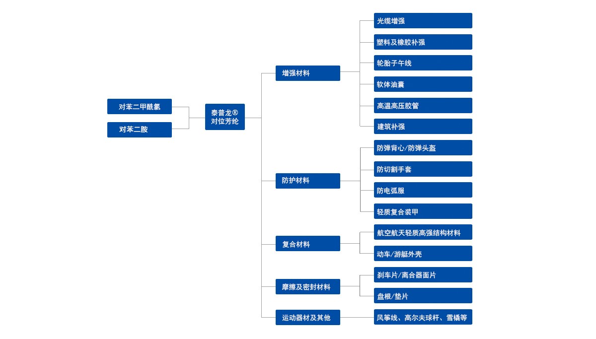 “十一五”期間,我國在對位芳綸工程化技術方面取得了實質性突破。煙臺泰和新材料股份有限公司2008年建成國內首條百噸級連續運轉生產線,產品主要性能指標達到國外同類產品先進水平。2011年5月,泰和新材1000噸/年對位芳綸產業化項目順利投產,泰普龍®對位芳綸成功推向市場,在汽車膠管、光纖光纜、摩擦密封和個體防護等領域得到迅速推廣應用。至此,泰和新材已成為國內唯一擁有間位芳綸、對位芳綸等芳綸全套系產品,具有較強市場保障能力的專業化芳綸產品供應商。